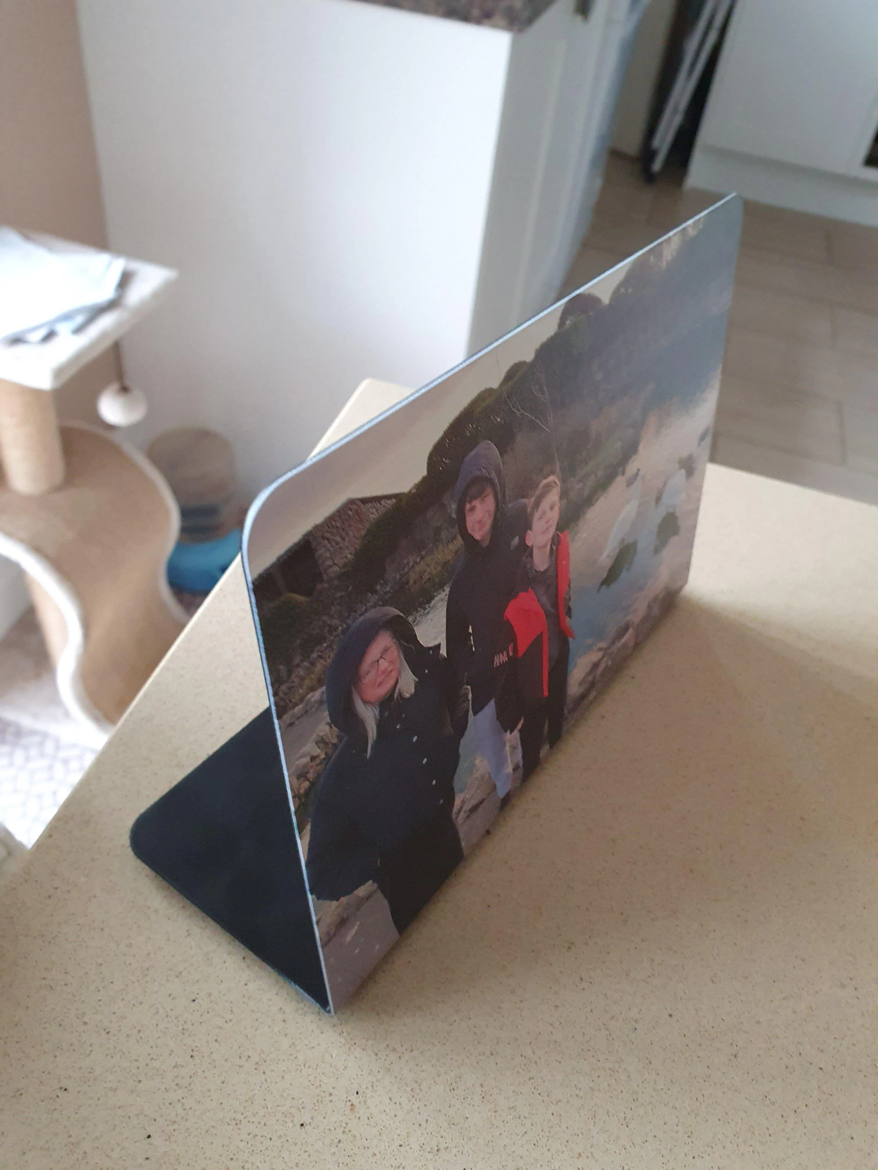 Crafted from a single sheet of Zintec steel, this landscape stand features an 80-degree bend with precision-rounded edges and a durable black powder-coat finish. Your custom image is primed and printed directly onto the surface, creating a seamless, professional appearance. Four rubber feet provide stability and protect surfaces from scratches. This contemporary display solution offers a modern alternative to conventional framing, combining industrial design with personalised imagery for striking home or office décor.
